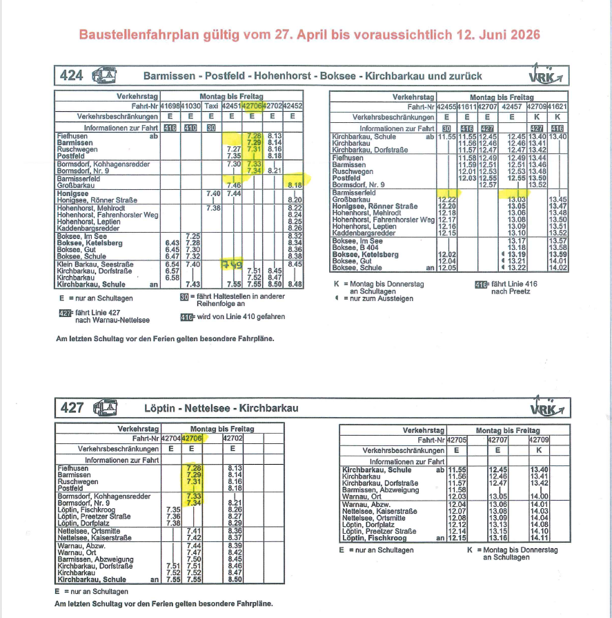 Aufgrund dieser Maßnahme ergeben sich insbesondere im Rahmen der Schülerbeförderung nach/von der Schule Kirchbarkau einige Änderungen in den Fahrplänen der VKP-Linien 424 und 427 (siehe Link Baustellenfahrplan gültig vom 27. April 2026 bis voraussichtlich 12. Juni 2026).